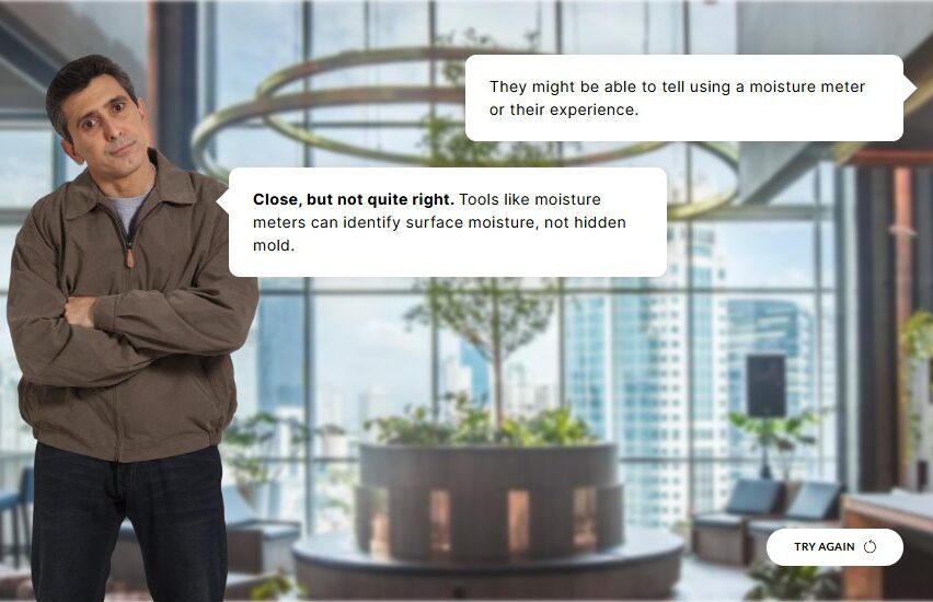 The scenario is not testing recall. It is testing whether learners can apply SoP-aligned language under the kind of pressure that exists in a real post-inspection conversation: a client who is anxious, asking fast questions, and looking to the agent for certainty. Each choice leads to a different outcome, making the consequences of imprecise language visible rather than abstract.